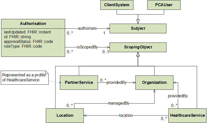 As shown above, Authorisation specifies a roleType that the associated Subject (either a PCAUser or a ClientSystem) can perform on a set of FHIR resources that are 'contained by' the scopingObject.