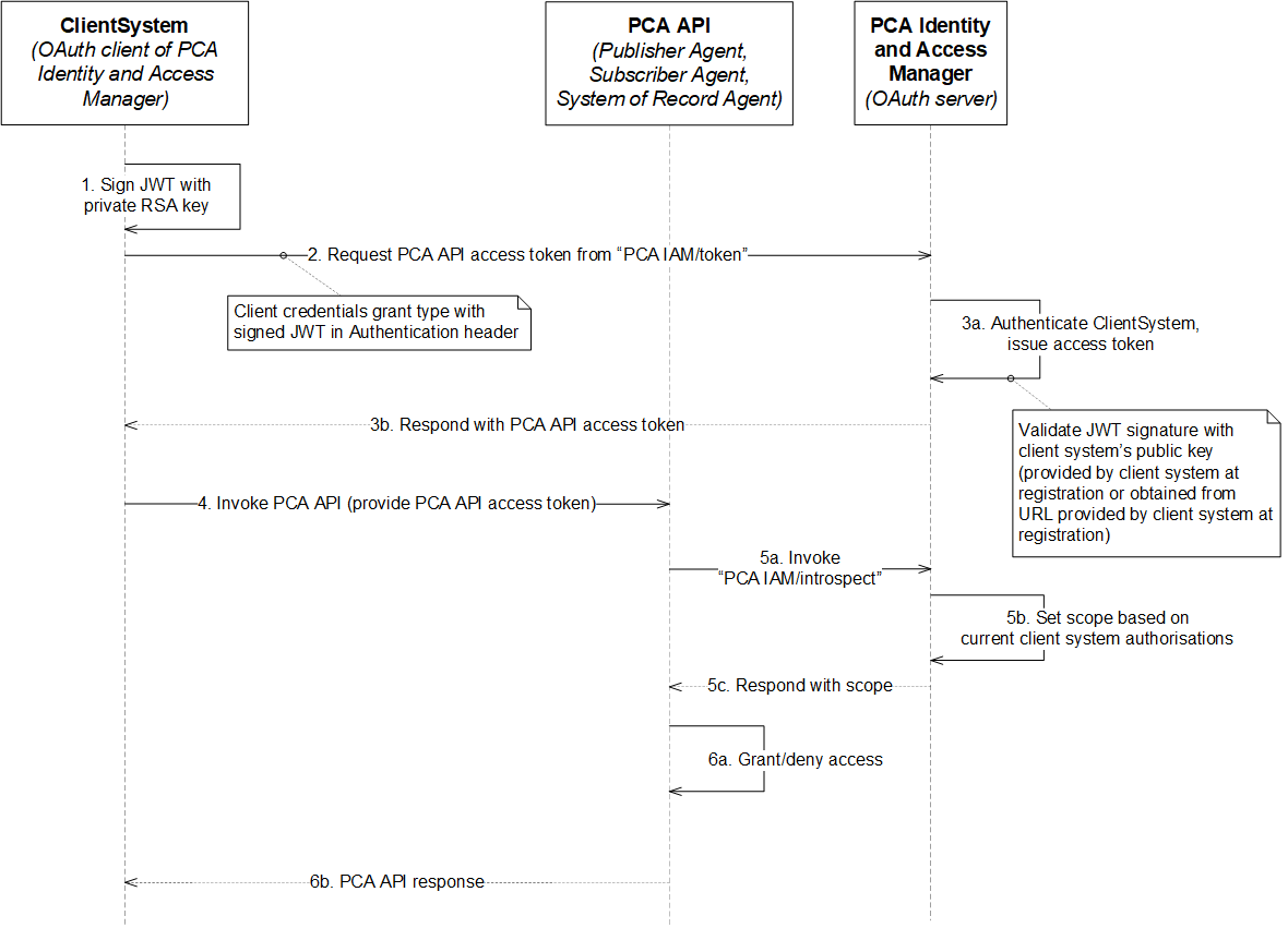 On receipt of a valid token request, the PCA Identity and Access Manager will validate the client credentials in accordance with section 3 of RFC 7523.
