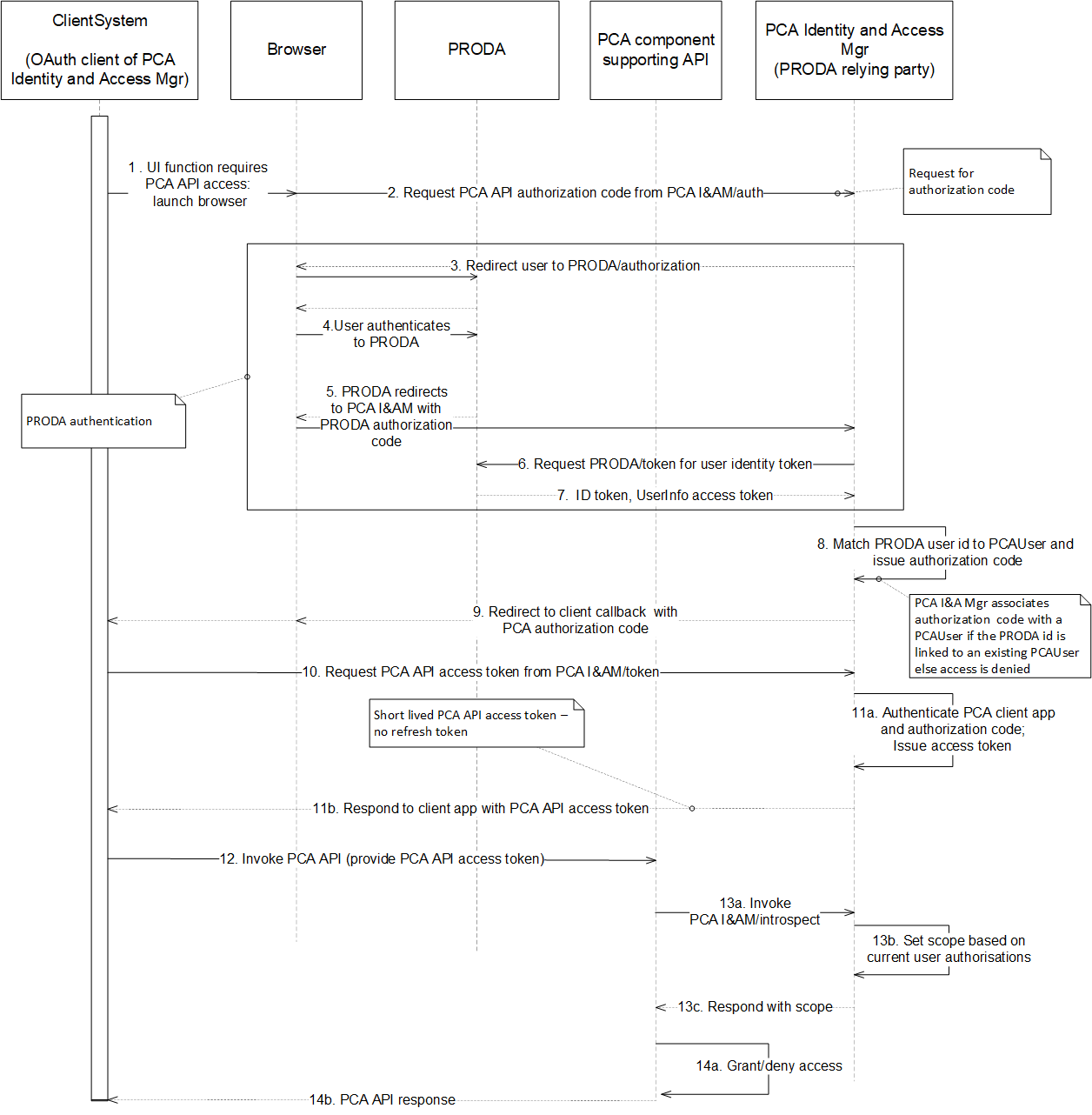 - PRODA provides the PRODA authorization code to the PCA Identity and Access Manager via the OAuth2.0 authorization code grant type.